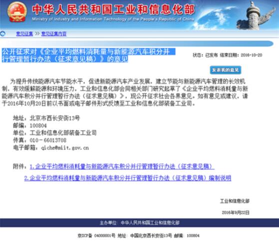 2016年9月,工信部首次發布《企業平均燃料消耗量與新能源汽車積分并行管理暫行辦法》(征求意見稿),要求年產量或進口量大于5萬輛的傳統乘用車企業需生產或進口一定比例的新能源乘用車。其中規定,2018年至2020年,新能源汽車積分比例要求分別為8%、10%、12%。