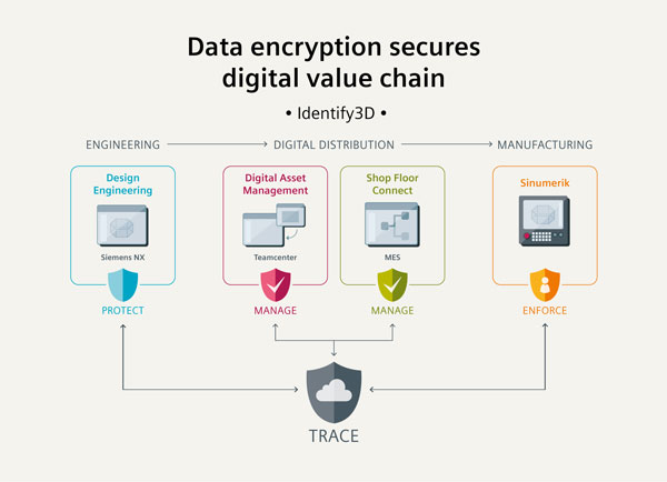 當(dāng)?shù)谌椒⻊?wù)提供商參與制造過程時,西門子能為數(shù)字化領(lǐng)域的數(shù)據(jù)保護帶來全新的、全方位的可能性。考慮到數(shù)據(jù)安全許可和加密,西門子已經(jīng)與Identify3D(ID3D)建立了戰(zhàn)略伙伴關(guān)系。ID3D已將確保數(shù)字化生產(chǎn)流程安全和可追溯性的解決方案集成于西門子的Sinumerik和PLM(產(chǎn)品生命周期管理)的產(chǎn)品組合。包括時間戳在內(nèi)的數(shù)據(jù)加密已被納入3D CAM(計算機輔助制造)軟件NX。解密在Sinumerik 840D sl上進行。通過與Identify3D開展合作,西門子已經(jīng)實現(xiàn)利用端到端安全解決方案保護貫穿價值鏈各環(huán)節(jié)的所有流程數(shù)據(jù)的完整性。西門子與Indentify3D將在2017年德國漢諾威國際機床展(EMO)上展示該軟件集成。通過將這些全新解決方案集成于西門子的產(chǎn)品組合,客戶將能保護其知識產(chǎn)權(quán),根據(jù)分別定義的參數(shù)生產(chǎn)產(chǎn)品,并全面跟蹤生產(chǎn)部件。