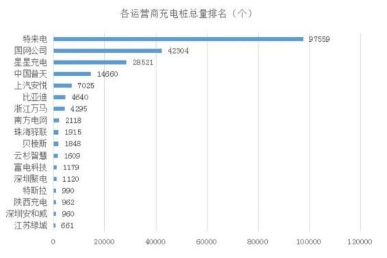 充電運營商方面,特來電投建并運營了97559個充電樁,占比46%,位居第一。第二名國網42304 個,占比20%。隨后是星星充電28521個和中國普天14660個。四大運營商累計占到市場總量的86%。