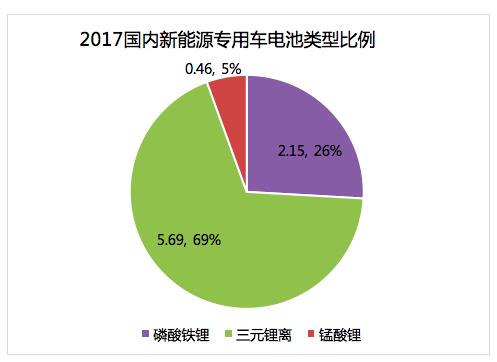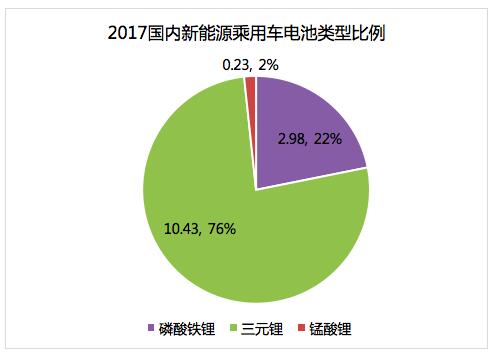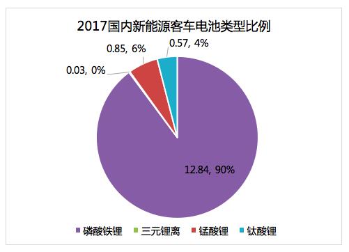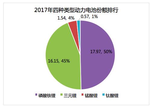 在2017全年的動力電池出貨中,磷酸鐵鋰電池占比50%,三元鋰電池占比45%,錳酸鋰電池占比4%,鈦酸鋰電池占比1%。