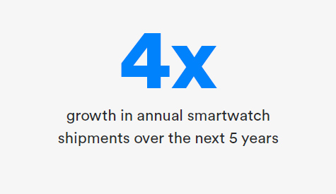 目前,能夠提供更加專業(yè)化、多用途功能的新型健身設(shè)備已經(jīng)出現(xiàn),并將呈現(xiàn)持續(xù)增長態(tài)勢。智能手表市場也變得更加多樣化,并將保持穩(wěn)定的增長軌跡。根據(jù)《2018年藍(lán)牙市場最新資訊》顯示,至2022年,智能手表年出貨量將增長4倍。