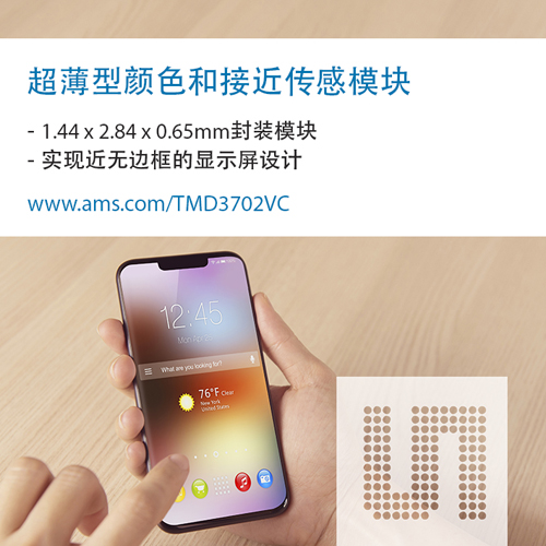艾邁斯半導體高級產品營銷經理DaveMoon表示:“如今智能手機工業設計面臨的一大趨勢是增大屏占比、將顯示屏尺寸最大化,而邊框區域的最小化則需要借助最小的模塊解決方案。TMD3702VC超小的外形尺寸有助于滿足這一需求,讓顯示屏邊框幾乎消失。TMD3702為手機設計師提供的解決方案比前一代產品縮小60%以上,可以幫助他們將分配給前置環境光和接近感應的空間最小化。”