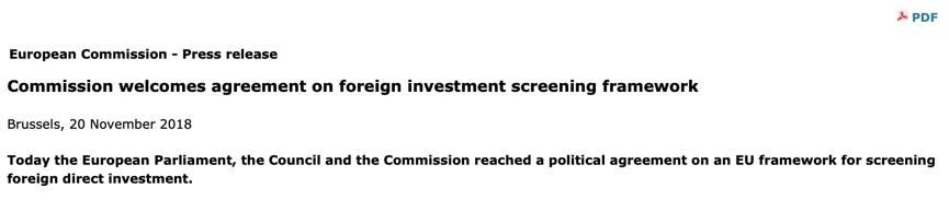 此外,在11月20日的比利時(shí)布魯塞爾,歐盟委員會(huì)也提出了設(shè)立外國(guó)投資審查機(jī)制的制度草案,以保護(hù)對(duì)歐洲安全有影響的產(chǎn)業(yè)。其中,歐盟提出防止國(guó)外威脅的“關(guān)鍵基礎(chǔ)設(shè)施”(criticalinfrastructure)包括能源、交通、通訊、數(shù)據(jù)、太空以及金融產(chǎn)業(yè),關(guān)鍵科技領(lǐng)域(criticaltechnologies)包括半導(dǎo)體、機(jī)器人和人工智能等。11月20日,歐盟又將水資源、納米技術(shù)、醫(yī)療健康、電動(dòng)電池、國(guó)防、媒體、生物科技以及食品安全領(lǐng)域也納入保護(hù)范圍,可以看到歐盟的受保護(hù)領(lǐng)域與美國(guó)FIRRMA有極大部分的重合,與美國(guó)不同的是歐盟的對(duì)外投資審查機(jī)制為非強(qiáng)制,然而對(duì)于歐盟成員國(guó)的交易,歐盟政府允許詢問(wèn)信息及發(fā)表評(píng)論(comments),委員會(huì)則可以詢問(wèn)信息并發(fā)表意見(jiàn)(opinion),對(duì)于評(píng)論與意見(jiàn)交易相關(guān)成員國(guó)應(yīng)當(dāng)給予“應(yīng)有的考量”(dueconsideration),對(duì)于可能影響歐盟的項(xiàng)目或計(jì)劃的投資應(yīng)當(dāng)給予“最大程度的考慮”(take“utmostaccount”of)。