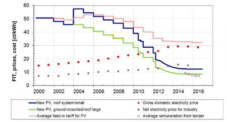 下圖顯示了德國電力價格的演進趨勢。在2006年,德國的一名工業(yè)用戶銷售其生產的光伏能源的價格約為每千瓦時0.40歐元,再以約10分/千瓦時的更低費率購買電力,輸出光伏能源具有經濟優(yōu)勢,因為該方案更受青睞。十年之后的2016年,光伏能源的銷售價格已經低于電費,因此自產自消更加有利可圖。