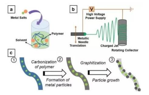 此外,UCR研究人員利用靜電紡絲(electro spinning)技術,制造出含有金屬離子(鈷、鐵或鎳)的碳納米纖維紙薄片。在加熱時,離子形成超細金屬納米顆粒,其催化碳轉化為高性能石墨碳。隨后,金屬納米顆粒和殘余的非石墨碳被氧化,導致高度多孔且有用的金屬氧化物納米顆粒網絡分散在石墨的多孔網絡中。