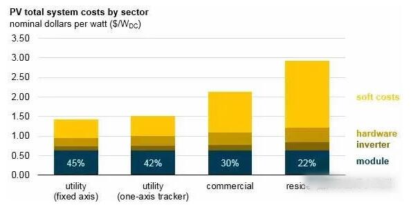 光伏系統(tǒng)成本包括硬件成本(光伏組件、逆變器等)和軟性成本(營銷、勞動(dòng)力、許可證、檢測、并網(wǎng)等),雖然硬件成本不斷降低,但是硬件占整個(gè)光伏系統(tǒng)的比例有多大呢?我們來看美國的情況。