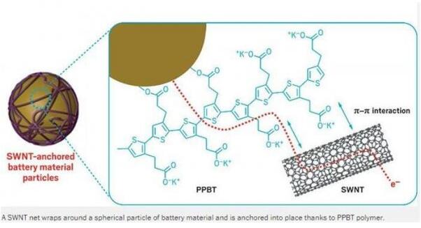 PPBT的羧酸根基團(carboxylate groups)可與電池材料的極曲面(polar surface)相配合,噻吩骨干(thiophene backbone)可利用π-鍵合(π-bonding)與SWNT發生接觸,電子可在SWNT-PPBT網狀結構內流動。電池材料周邊的納米管網絡呈現多孔結構,可供鋰離子在電池材料中移動,還能防止電池材料膨脹。