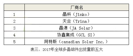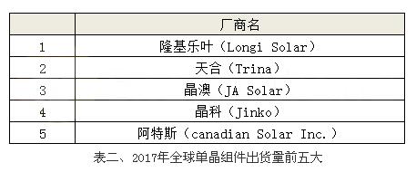 若是以單晶組件出貨排名來看;我們可以明顯看到單晶硅片龍頭大廠隆基樂葉一舉躍升為首位,主要原因在于該廠為專注于單晶產(chǎn)品的生產(chǎn)制造;舉凡從上游的硅片、中間的電池到組件出貨,皆是以單晶作為品牌著稱,預(yù)期2018年會有超過倍數(shù)成長的實力。
