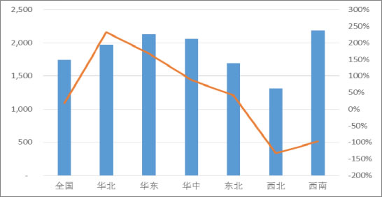 2016年分區(qū)域風(fēng)電利用小時數(shù)(小時,%)