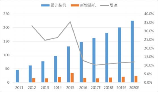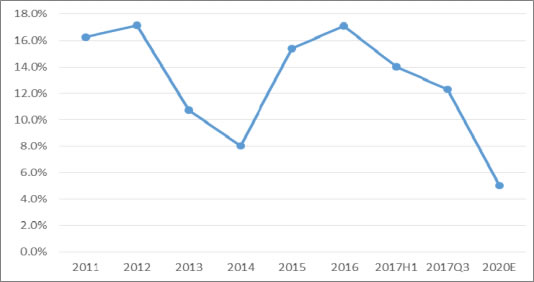 由于棄風(fēng)率仍未達(dá)標(biāo),紅色預(yù)警省份裝機不會在短期內(nèi)迅速恢復(fù),以及低風(fēng)速地區(qū)和海上風(fēng)電發(fā)展的技術(shù)壁壘仍然需要時間,我們預(yù)計,2018-2020年,風(fēng)電裝機的增速將在10%~12%,到2018年,我國風(fēng)電裝機約為180吉瓦,2020年,我國風(fēng)電裝機約為220吉瓦,年均增長20吉瓦,基本符合“十三五”規(guī)劃的目標(biāo)。進(jìn)入“十四五”時期,隨著東、中部風(fēng)電規(guī)模不斷擴大,以及海上風(fēng)電技術(shù)的成熟,和紅色預(yù)警省份裝機的恢復(fù),我們預(yù)計,風(fēng)電的裝機容量將會迎來新的發(fā)展期,增速將在10%~15%,但爆發(fā)式增長基本沒有可能。