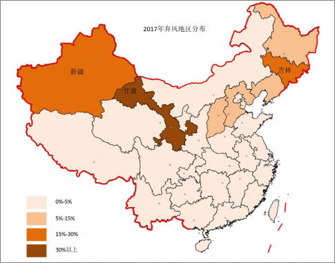 2017年,棄風(fēng)問題有所緩解,全國風(fēng)電設(shè)備平均利用小時1,386小時、同比提高135小時。棄風(fēng)電量295.5億千瓦時,同比減少103億千瓦時,棄風(fēng)率同比下降6.7個百分點,實現(xiàn)棄風(fēng)電量和棄風(fēng)率“雙降”。我國棄風(fēng)率拐點已現(xiàn)。2017年前三季度,新疆、甘肅和吉林是棄風(fēng)量最高的三個省區(qū),占全國棄風(fēng)總量的77%。其中,甘肅和新疆的棄風(fēng)率分別為33%和29.3%。雖然2017年棄風(fēng)率已經(jīng)在逐步下降,但離國家規(guī)劃的2020年棄風(fēng)率達(dá)到5%的目標(biāo)還有很大距離