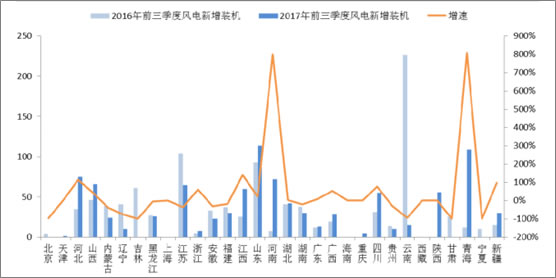 2016-2017前三季度各省風(fēng)電新增裝機及增速(萬千瓦,%)