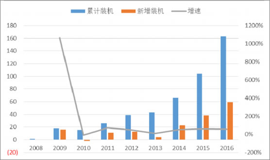 我國海上風(fēng)電發(fā)展相對較晚。2016年,中國海上風(fēng)電新增裝機154臺,容量達(dá)到59萬千瓦,同比增長64%,累積裝機容量達(dá)到163萬千瓦,約占全球海上風(fēng)電累計裝機容量的11%。