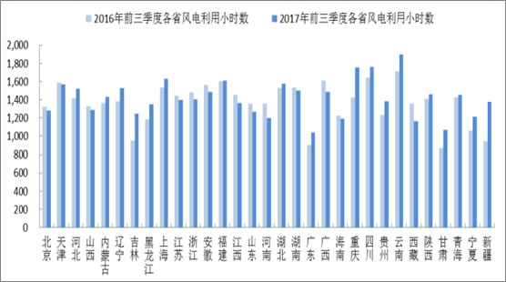 2016-2017前三季度全國各省風(fēng)電利用小時數(shù)(小時)