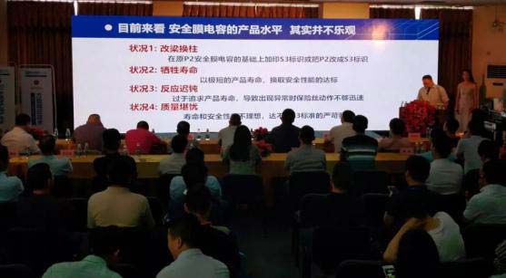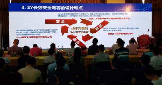 勝業(yè)研發(fā)總工程師陳榕向現(xiàn)場嘉賓詳細介紹“SY長效安全電容”的技術(shù)優(yōu)勢