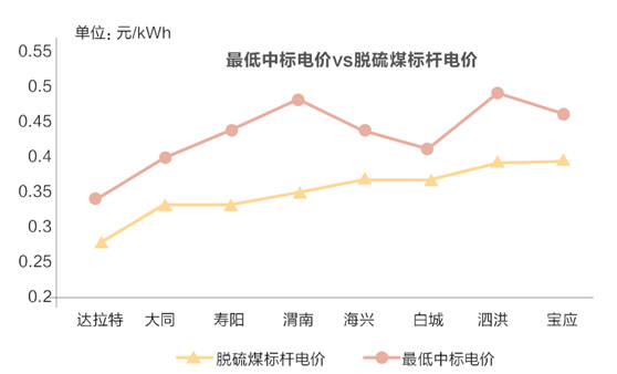 整體來看,與第二批領跑者相比,此次領跑者電價水平的降幅之大有目共睹。在第二批領跑者中,山西陽泉領跑基地的0.61元/kWh的中標電價已屬最低電價,而根據第三批領跑者的中標結果,最低中標電價與當地的脫硫煤標桿電價只相差3.6分/kWh。