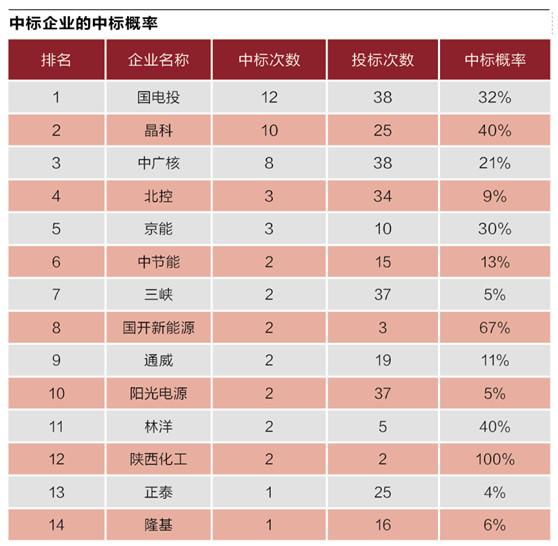 據統計,此次領跑者投標一共有52家企業參與,最終14家企業中標。其中,國電投、中廣核、晶科三家企業最終包攬了71%的規模,共計容量2843MW。