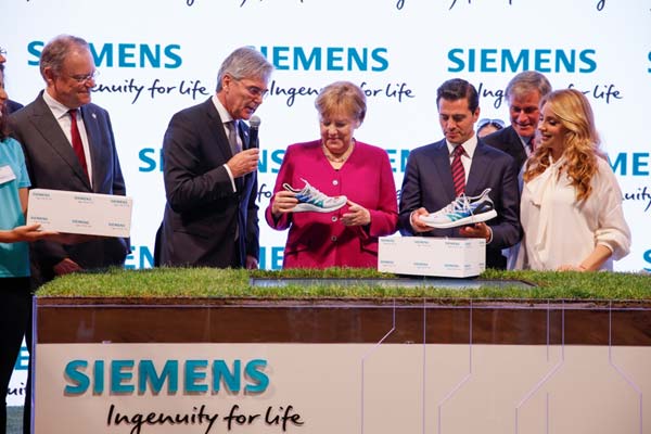 西門子股份公司總裁兼首席執(zhí)行官凱颯(Joe Kaeser)向德國總理默克爾和墨西哥總統(tǒng)培尼亞贈(zèng)送運(yùn)用西門子技術(shù)制造的運(yùn)動(dòng)鞋