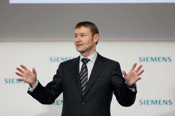西門子股份公司管理委員會(huì)成員何睿祺(Klaus Helmrich)在4月23日的漢諾威工業(yè)博覽會(huì)新聞發(fā)布會(huì)上講話