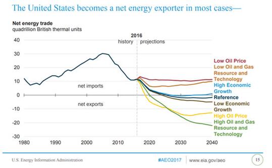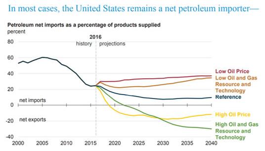 圖為美國石油進口歷史趨勢和未來預測,可見美國仍然是一個石油凈進口國(來源:美國能源信息署)