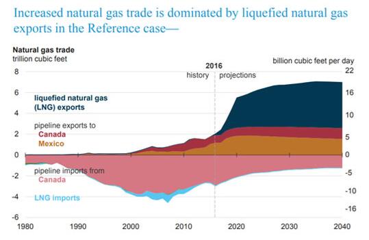 圖為美國向加拿大和墨西哥進出口天然氣的歷史和預期數額(來源:美國能源信息署)