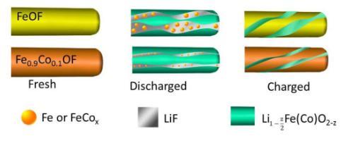 為克服這類技術(shù)挑戰(zhàn),研究團(tuán)隊(duì)利用化學(xué)品置換(chemical substitution)工藝向FeF3納米棒(nanorods)加入了鈷院子及氧原子,使得科研人員能操控反應(yīng)途徑(reaction pathway)并實(shí)現(xiàn)可逆反應(yīng)。