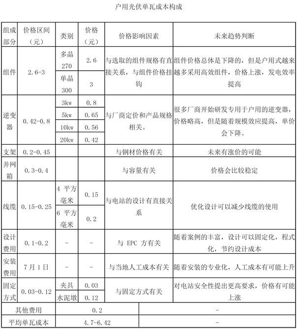 由于光伏材料的價格變化比較快,5-6.5元的每瓦成本僅作為市場參考值,由于廠家和經(jīng)銷商還要在當中環(huán)節(jié)獲利,假設(shè)廠商每瓦獲利0.5-1元,經(jīng)銷商每瓦獲利1-1.5元,那么到消費的價格大致是6.5-9元。與現(xiàn)在市場行情基本相符。從各個環(huán)節(jié)的價格影響因素和未來趨勢判斷,我們可以看到未來戶用式光伏單瓦價格不一定會下降,但是發(fā)電效率和安全性是一定會提高的。戶用光伏作為直接面向消費者的產(chǎn)品,具有投資品和消費品的雙重屬性,因此市場價格必然會有較大差異,產(chǎn)品差異性也會長期存在。但是有一點必須提出,戶用式光伏由于較高的單位成本,短期內(nèi)還是需要依靠補貼來保證收益率。