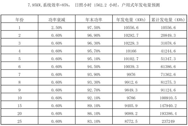 我們以山東濟南一戶安裝了30塊265Wp的高效組件,裝機容量共7.95KW,系統(tǒng)效率=85%,按照8元/w的系統(tǒng)價格計算,需要用戶投入資金約63600元。項目安裝地濟南地區(qū)全年日平均有效發(fā)電日照時數(shù)為4.28*365=1562.2小時(山東屬于日照條件比較好的地區(qū),可以達到1500小時,全國的平均水平約為1300小時左右)。假設(shè)組件首年衰減2.5%,之后每年衰減0.6%。可以算出一個8KW系統(tǒng),使用一臺8KW單相機逆變器,20年累計發(fā)電量約為20萬度,25年的累計發(fā)電量約23.7萬度。