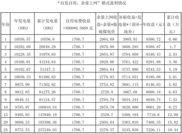 如果選擇“自發(fā)自用,余量上網(wǎng)”,那么戶用的收益來自于三部分,一是自用的電費即3000度*居民用電價格;二是“余量上網(wǎng)”的收益即發(fā)電量-自用電量(3000度)*當?shù)孛摿蛎荷暇W(wǎng)電價;三是補貼收益,不論是自用還是上網(wǎng),光伏發(fā)電的總量都會有國補(有些地區(qū)還有地補)即,光伏發(fā)電量*(國補+地補)。地補一般來講有時間限制,一般地區(qū)給出鼓勵是3-5年,因此我們以山東地區(qū)來測算,沒有地補,國補20-25年。