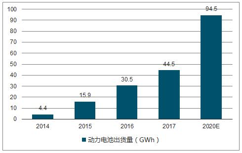 受益于新能源汽車市場的高速發展,動力電池的需求得以不斷提升。我國動力電池出貨量從2014年的4.4GWh上升到2017年的44.5GWh,CAGR為116.3%,預計到2020年可達到94.5GWh,未來三年CAGR在30%左右。