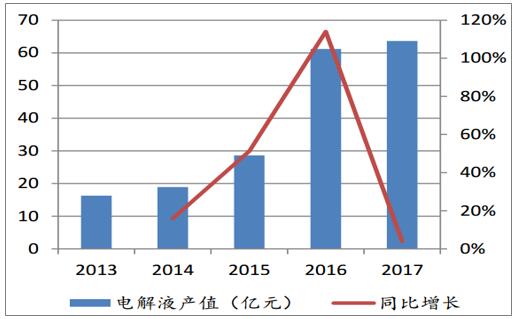 電解液作為鋰電池四大原材料(正極材料、負極材料、隔膜、電解液)之一,在動力電池需求不斷增加的帶動下,近年來產量和產值也實現了快速增長。數據顯示,2017年我國電解液產量11萬噸,同比增長23.3%。一方面是由于動力電池電解液產量上升;另一方面是由于出口量保持穩定增長。從產值來看,2017年國內電解液產值為63.6億元,同比增長3.9%,主要由于原材料六氟磷酸鋰大幅降價導致電解液價格大幅下滑,使得電解液產值增速低于產量增速。
