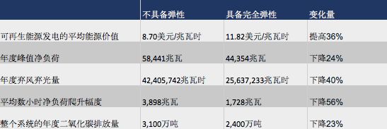 需求彈性不僅可以使需求更好地匹配波動性的能源供應,還能夠以比僅依靠燃氣電廠綜合成本更低、碳排放更少的系統來平衡可再生能源并滿足峰值負荷需求。總體來看,在模擬系統中利用需求彈性能夠每年避免大約20億美元的發電成本,并減少1/5的二氧化碳排放。這一量級的彈性需求還能夠減少40%的可再生能源棄風棄光,降低24%的凈負荷峰值(總負荷減去可再生發電),并減少56%的數小時負荷爬升(“鴨子曲線”)平均幅度。