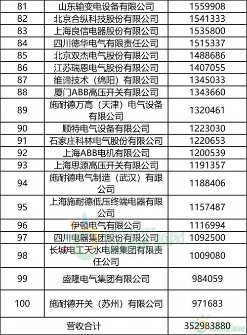 本次榜單上全部企業營收累計超過3529億,比去年上榜企業累計的3480億元的營收同比增長了12.51%。百強榜單上各個企業不斷增長的營收能力充分說明了我國有一批電能裝備供應商正在快速崛起,電氣化的巨大進步不僅推動了我國經濟的進步,同時也提升了中國工業整體的核心競爭力。