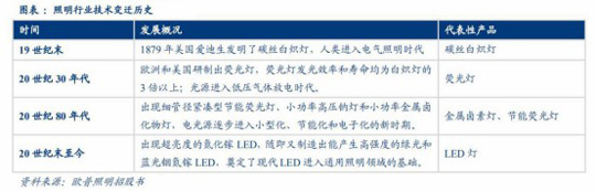 電氣光源的發(fā)展從19世紀末期開始至今已經(jīng)經(jīng)歷了上百余年,經(jīng)歷了四個不同發(fā)展階段,每個階段都有新的突破,各階段主要代表性產(chǎn)品分別是白熾燈、熒光燈、鹵素燈及節(jié)能燈、LED燈。各個階段代表性照明產(chǎn)品各有優(yōu)劣勢,但照明行業(yè)整體朝著環(huán)保節(jié)能的方向發(fā)展。