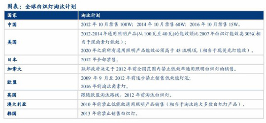 在各類照明產(chǎn)品中,白熾燈歷史悠久,使用范圍廣闊,但由于其通過物質(zhì)輻射發(fā)光,能量轉(zhuǎn)換效率(即光效)較低,世界各國已陸續(xù)明確了淘汰白熾燈的時間表。其中,歐洲、澳大利亞、日本、美國等國淘汰計劃啟動相對較早,而我國發(fā)改委于2011年11月正式發(fā)布白熾燈淘汰路線圖,計劃到2016年全面禁止白熾燈的進口與銷售。