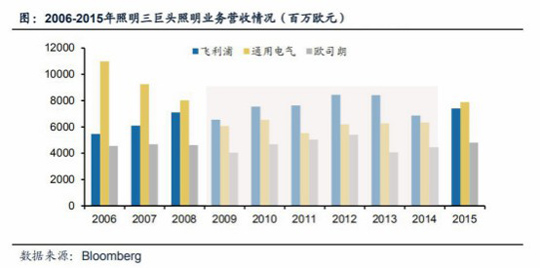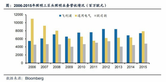 在幾年前,飛利浦與通用電氣、歐司朗是世界最大的三家照明企業(yè),飛利浦與通用電氣交替領(lǐng)先全球照明市場。2009至2014年飛利浦照明業(yè)務營業(yè)收入連續(xù)6年排名全球第一。