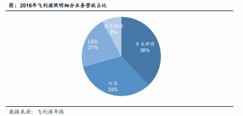 此后,在飛利浦、通用電氣、歐司朗這昔日世界三大照明企業(yè)中,飛利浦與通用電氣交替領(lǐng)先全球照明市場。2009至2014年飛利浦照明業(yè)務營業(yè)收入連續(xù)6年排名全球第一。僅2016年,飛利浦照明業(yè)務營收71億歐元,占公司總營收的29%。其照明業(yè)務主要細分為四類:專業(yè)照明、燈具、LED以及家居照明,專業(yè)照明在照明業(yè)務中占比最高,營收27億歐元,占照明業(yè)務的38%。