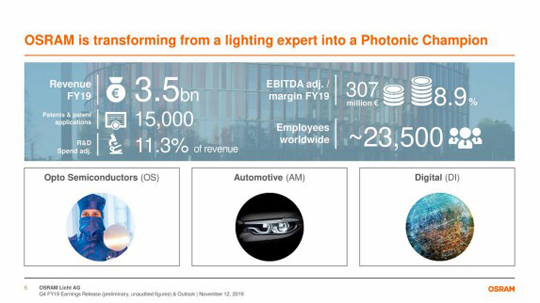 今年11月,歐司朗發(fā)布了2019財年全年可比收入下降13%至約35億歐元。總體而言,業(yè)務呈現(xiàn)下滑趨勢。