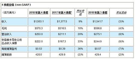 2019年2月12日 – 安森美半導體公司 (ON Semiconductor Corporation,美國納斯達克上市代號:ON) 于美國時間2月1日宣布,2018年第4季度總收入為1,503.1百萬美元,較去年同一季度上升約9%。2018年第4季度的收入較2018年第3季度下跌約3%。