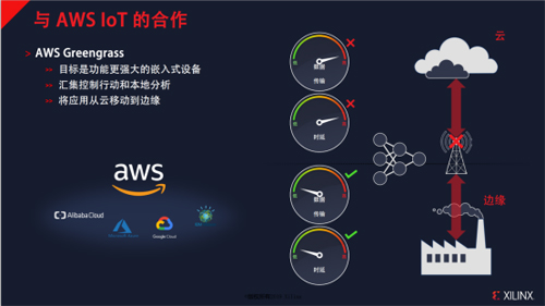 在一定條件下,如果將工業和醫療互聯網應用部署于云端,不僅延時非常高,而且傳輸的需求非常大,這就意味著客戶與其自己的客戶要花費很多時間和精力去做數據傳輸,且效果也不盡理想。因此,賽靈思首先與亞馬遜的云服務開展這方面合作,在它的Greengrass框架下來使用它的功能,把云端可以移動到邊緣。通過這種方式,工業和醫療互聯網應用在運行時不僅大大地減少了數據量的傳輸,而且延時也大幅度地降低。此外,還有連接部分,其實在很多工業和醫療互聯網應用場景中,連接并不是給定的條件,很多連接是時斷時續的,所以如果能夠把智能放在邊緣,也就是即使是在云端連接丟失的情況下,應用依然能夠正常運行。
