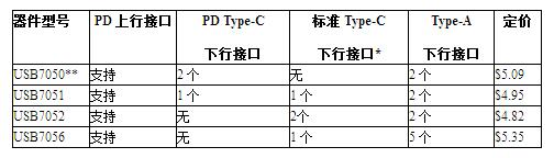 UPD301A現已上市,單價為1.50美元,10,000枚起售。USB705x系列產品也已上市,10,000枚起售,型號和價格可選,具體如下: