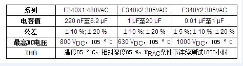 F340X1額定電壓為480 VAC,電容值0.22µF至8.2µF,最高工作電壓達530 VAC,確保符合三相電源電壓變化的要求。F340X2額定電壓305 VAC,電容值1µF至20µF,10 kHz條件下紋波電流最高可達18 A。F340Y2符合AEC-Q200認證標準,額定電壓305 VAC,電容值10 nF至1µF。