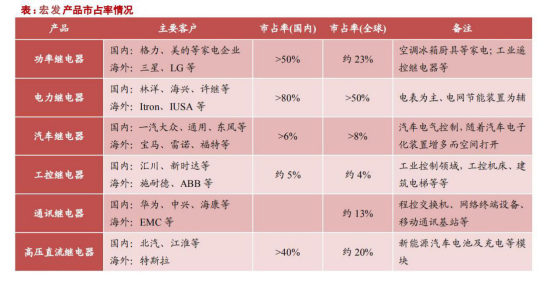 據悉,目前宏發高壓直流繼電器滿產狀態,且在提升產線自動化率。雖然產品有年化5%降價的壓力存在,但產線升級有望帶動成本下降。近年來在國內外市占率穩步提升,在產能的持續增大及大多數新簽客戶處于小批量供貨的背景下,宏發相關產品未來幾年市占率繼續提升的確定性較強。