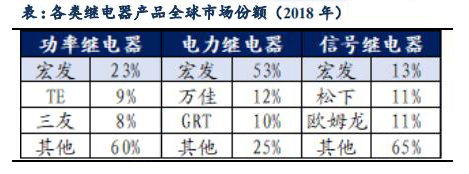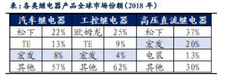 目前,宏發在高壓直流繼電器領域的主要對手是松下、電裝。數據顯示,2018年日本松下、電裝(Denso)及宏發占據了全球高壓直流繼電器絕大部分市場份額(70%),其中日系松下占率約37%,電裝市占率約13%,分列第一、三;宏發全球市占率約20%,位列第二。同期,宏發高壓直流繼電器在國內市占率超40%,位列市場第一。