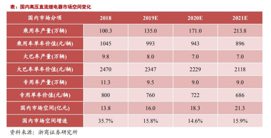 據浙商證券研報數據顯示,2017-2018年我國高壓直流繼電器市場,主繼電器售價在350-400元間,輔助繼電器約70-100元,國內價格稍高于國外,行業預計是每年約5%的價格降幅。按照乘用車一輛采用2主4輔的使用量計算,在不配套控制盒的情況下,國內一臺乘用車需求價值量約1000-1200元,海外車企乘用車單車價值近1000元。而配套控制盒的國內乘用車單車可近2000元。此外大巴車相對單車價值更高,多數在2500元以上,甚至可達3000元/輛。因為我國人口規模龐大,地理幅員遼闊,對乘用車、大巴、專用車等各類車輛的需求量大,因此與之相對應的可供開拓的高壓直流繼電器市場需求空間也巨大。