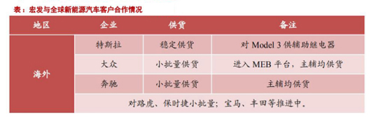 資料顯示,目前宏發的高壓直流產品已經實現對一汽大眾、通用、東風、北汽、比亞迪、寧德時代等國內主要主機廠及電池企業,供應鏈批量供貨;同時并對大眾、福特、奔馳、路虎、保時捷、雷諾等海外標桿客戶實現小批量供貨;與寶馬、豐田等廠商合作也正在推進。