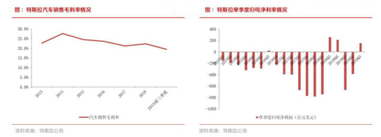 近年來特斯拉汽車銷售毛利率呈現逐漸下降的趨勢,2019年前三季度毛利率為19.4%,較2014年的高點下降近8.2個百分點。