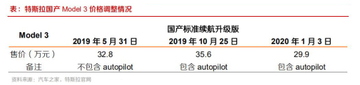 2019年來特斯拉國產Model 3已經經過三次價格調整。國產標準續航升級版Model3在2019年5月首次定價為32.8萬元,但其不包含autopilot自動駕駛系統。2019年10月包含autopilot的國產Model 3定價為35.6萬元。2020年1月3日,特斯拉國產Model3價格下調至29.9萬元,較之前的35.6萬元下降16%。
