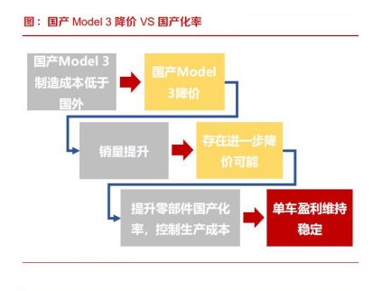 目前國產Model 3的制造成本低于國外,特斯拉具備降價空間。為進一步促進國產Model 3銷量提升,特斯拉有望進一步采取降價措施;預計特斯拉采取提升零部件國產化率的方式,進一步控制國產Model 3的制造成本,使其保持一定的盈利水平,從而拉動公司整體的盈利水平提升。