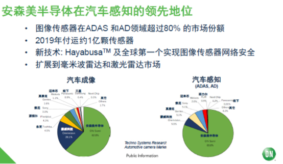 據(jù)日本TSR(Techno Systems Research)市場調(diào)研結(jié)果顯示,安森美在汽車成像和汽車感知兩大市場,占據(jù)絕對領(lǐng)導(dǎo)優(yōu)勢。其中,在汽車成像市場,如駕駛員、乘客、后視、環(huán)視、電子后視鏡等應(yīng)用領(lǐng)域,安森美全球市場占比超過60%;在汽車感知市場,即為人工智能和機器視覺用的感知系統(tǒng),全球市占比更是高達80%以上,且還在逐年擴大。